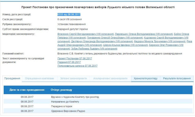 Проект Постанови про призначення позачергових виборів Луцького міського голови Волинської області зареєстрований у парламенті під номером 6555 від 08.06.2017.