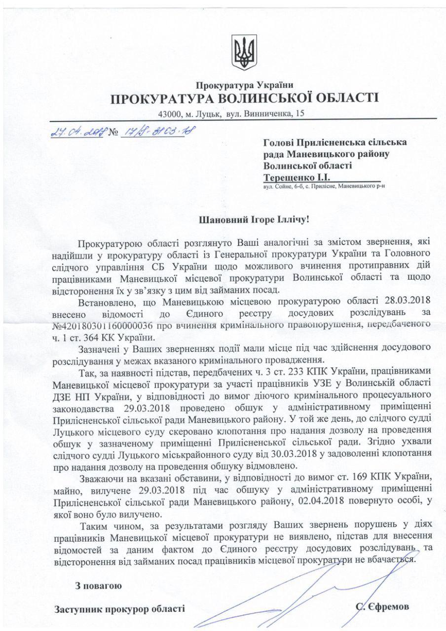Однак Прокуратура Волинської області, оскільки не виявила в діях маневицьких прокурорів жодних порушень, зазначила у відповідь на звернення, що підстав для початку досудового розслідування щодо правомірності дій працівників Маневицької місцевої прокуратури, як і для їх відсторонення від займаних посад «не вбачається».
