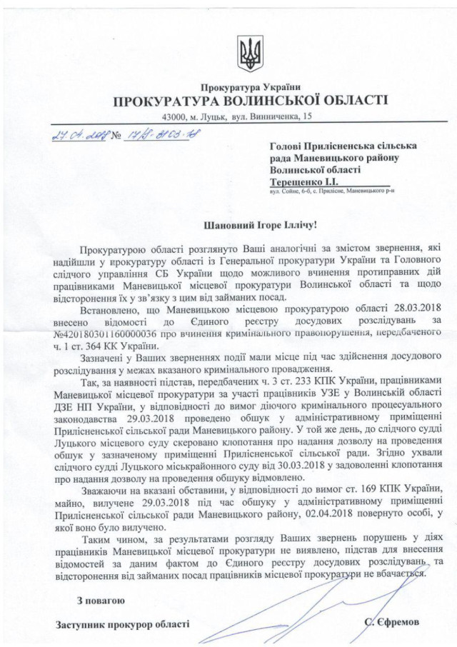 Прокуратура Волинської області не виявила порушень у діях працівників Маневицької місцевої прокуратури, які, не дочекавшись ухвали суду, провели незаконний обшук і вилучення документів у приміщенні Прилісненської сільської ради.