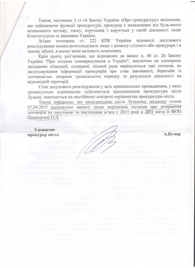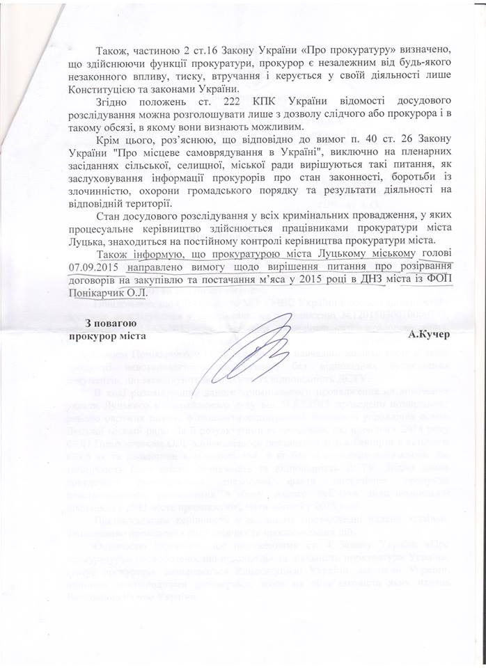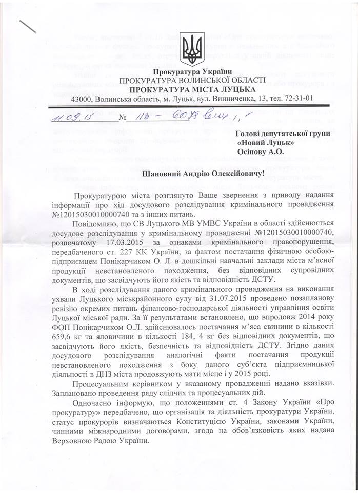 Зі слів Андрія Осіпова, прокуратура таки змушена активізувати дії щодо розслідування кримінальної справи у питанні поставок неякісного м’яса та продукції без документів ФОП "Понікарчик" до ДНЗ, а також щодо посадових осіб конкурсного комітету Управління освіти Луцькради (ст. 364 КК України), які збільшили ціну на м’ясо після проведеного тендеру на 10%, в той час як на ринку відбулося загальне зниження ціни на такий товар.