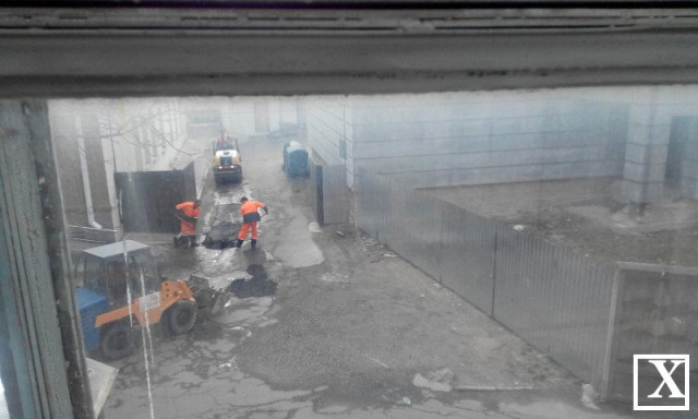 Обідньої пори учора, 31 березня, працівники дорожньої фірми латали яму на виїзді з внутрішнього двору прокуратури. Фото опублікувало видання «Хроніки Любарта».