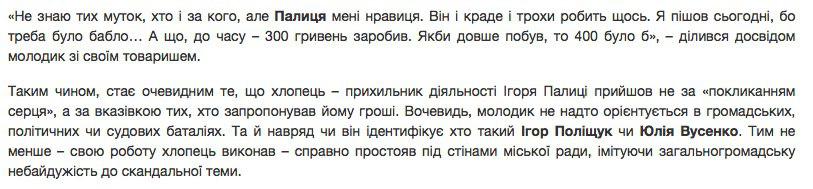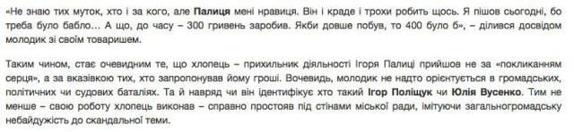Зокрема, молодик розповідав своєму товаришу: «Не знаю тих муток, хто і за кого, але Палиця (Голова Волинської обласної ради Ігор Палиця, - ред.) мені нравиця.... Я пішов сьогодні, бо треба було бабло… А що до часу – 300 гривень заробив. Якби довше побув, то 400 було б».