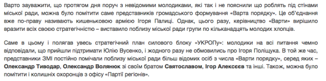 У «Варті порядку» також заявляють, що до підозрілих молодих людей декілька разів підходили Андрій Дяченко (керівник обласного осередку ПП «Національний корпус», - ред.) та Сергій Рижков (активіст Самооборони, - ред.), про щось довго розмовляючи, певно даючи вказівки. Окрім того, як наголошують у ГФ, поспішила відхреститись від молодиків і Юлія Вусенко, спочатку прикриваючись випадковою мамою біля міськради, потім просила захисту від «тітушок». А врешті-решт все ж мило давала інтерв’ю у їх присутності.