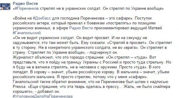 Журналіст Матвій Ганапольский в ефірі«Радио Вести»прокоментував поступок Порєченкова: