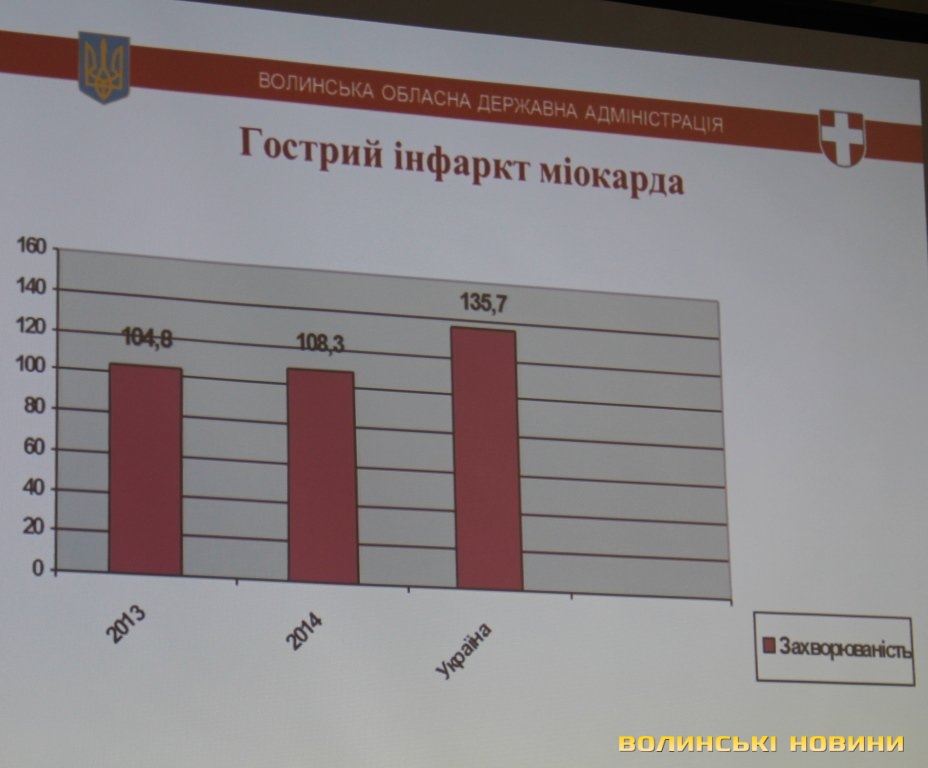 Стабільна поширеність та захворюваність хворобами системи кровообігу, зокрема гострим інфарктом міокарда та інсультами (показник Волині вищий, ніж загальноукраїнський). Водночас тромболізисну терапію тепер здійснюють не лише у Луцьку, а майже у всіх районах області, протягом минулого року на Волині здійснили 814 коронарографій та 168 стентувань (116 – у Луцьку).