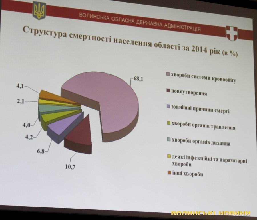Серед основних причин смертності волинян – хвороби системи кровообігу (68,1% серед причин смертності), новоутворення (10,7%), зовнішні причини смерті (6,8%), хвороби органів травлення (4,2%), хвороби органів дихання (4%). Ігор Ващенюк звернув увагу на те, що 14,8% хворих помирають поза стаціонаром.