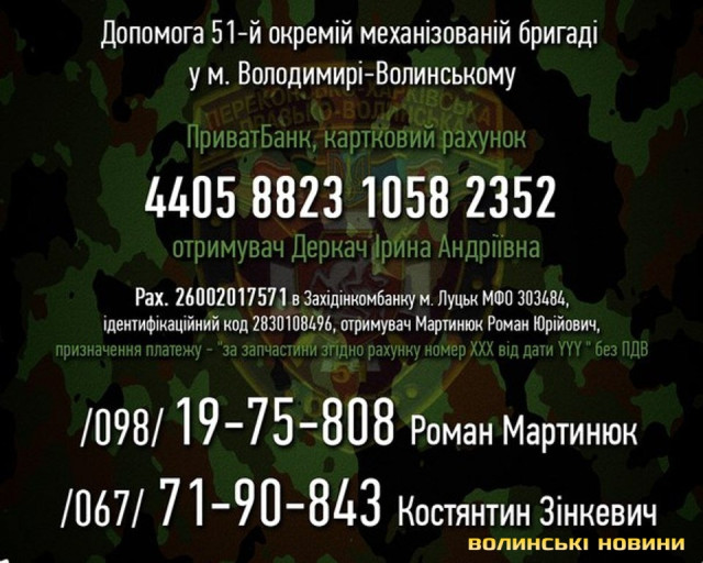 Військова частина А2333, вул. Ковельська, 265, код 07887288, МФО 803014, р/р 35227301000418 ДКСУ у Волинській області або надавати допомогу через рахунки громадських активістів.