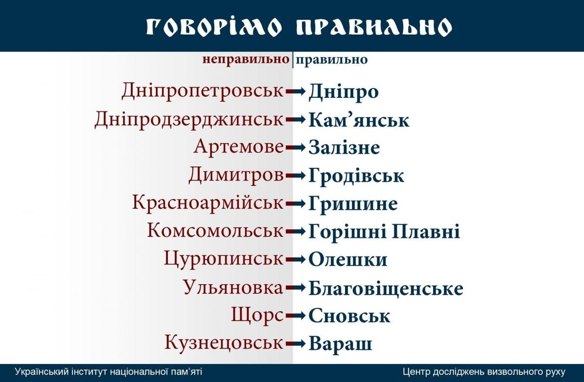 Окрім цього, серед міст нові назви отримали: Артемове – Залізне, Дніпродзержинськ – Кам’янське, Комсомольськ – Горішні Плавні, Кузнецовськ – Вараш, Ульяновка – Благовіщенське, Цюрупинськ – Олешки.