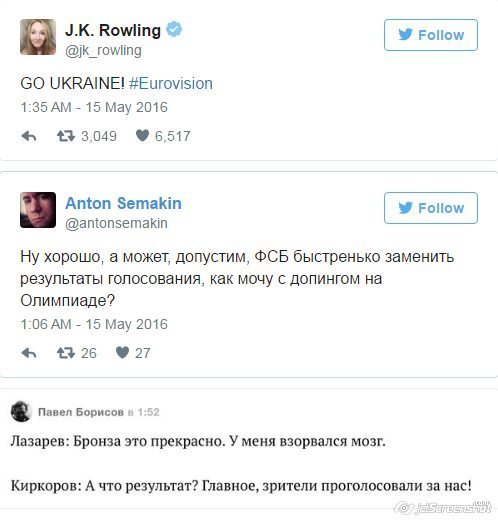 Завдяки неповторному виконанню пісні "1944" наступного року конкурс будуть проводити в Україні. У Мережі вітають Джамалу із значущою перемогою та пишуть, що пісенний конкурс у 2017 році слід проводити у Криму, звільненому від російських окупантів. Читайте також: Євробачення 2016. Як Україна протягом десятиліття підкорювала конкурс Також юзери публікують кумедні відео із своєю реакцією на голосування. Окрім звичайних людей українську тріумфаторку вітають відомі політики.