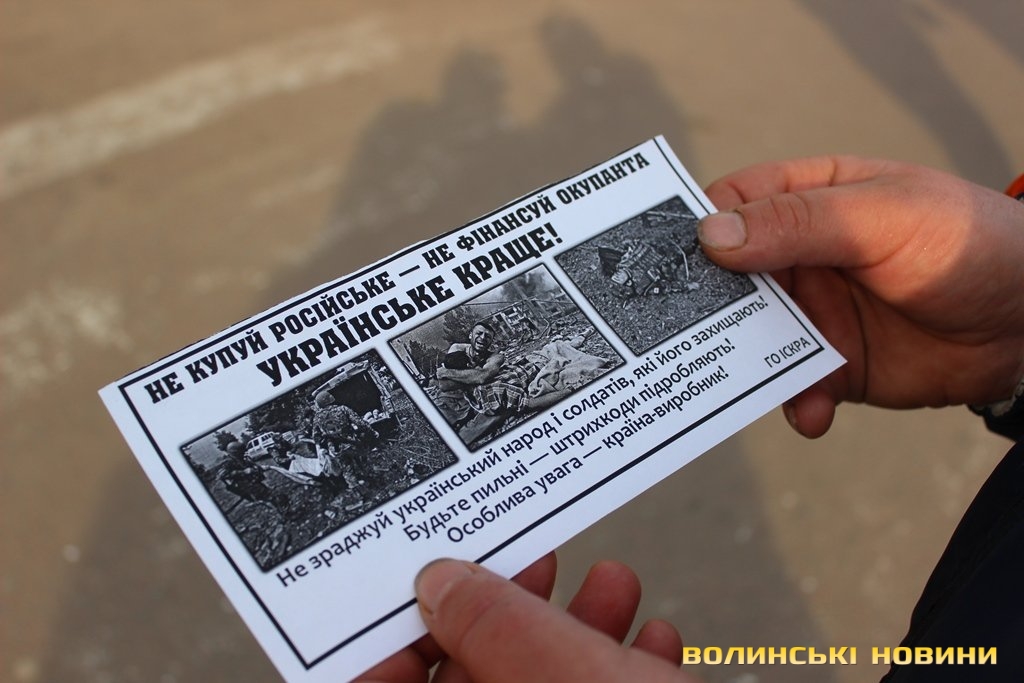 «Прибуток від імпорту товарів поступає в російську казну, з якої фінансується армія окупантів, що захопила український Крим і намагається зробити те ж саме на сході країни. Тому ми закликаємо лучан не спонсорувати ворожу армію, а користуватись товарами вітчизняного виробника. А також перевіряємо, чи, бува, не переклеюють штрих-коди не чесні на руку продавці», - пояснює очільник організації «Іскра».