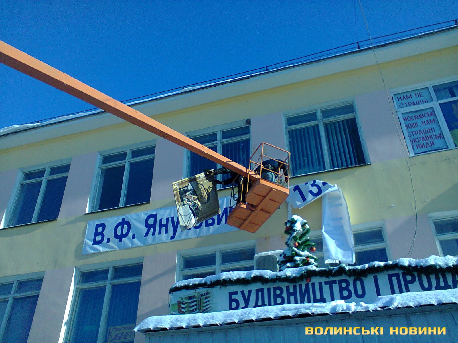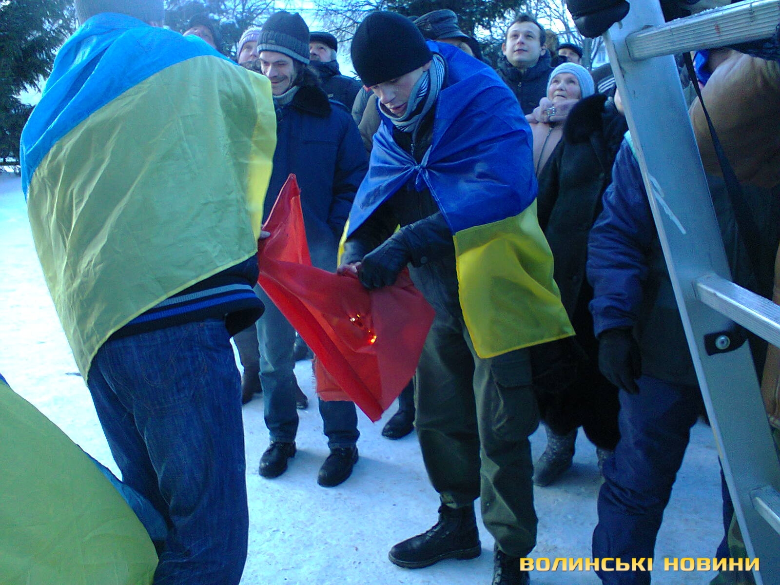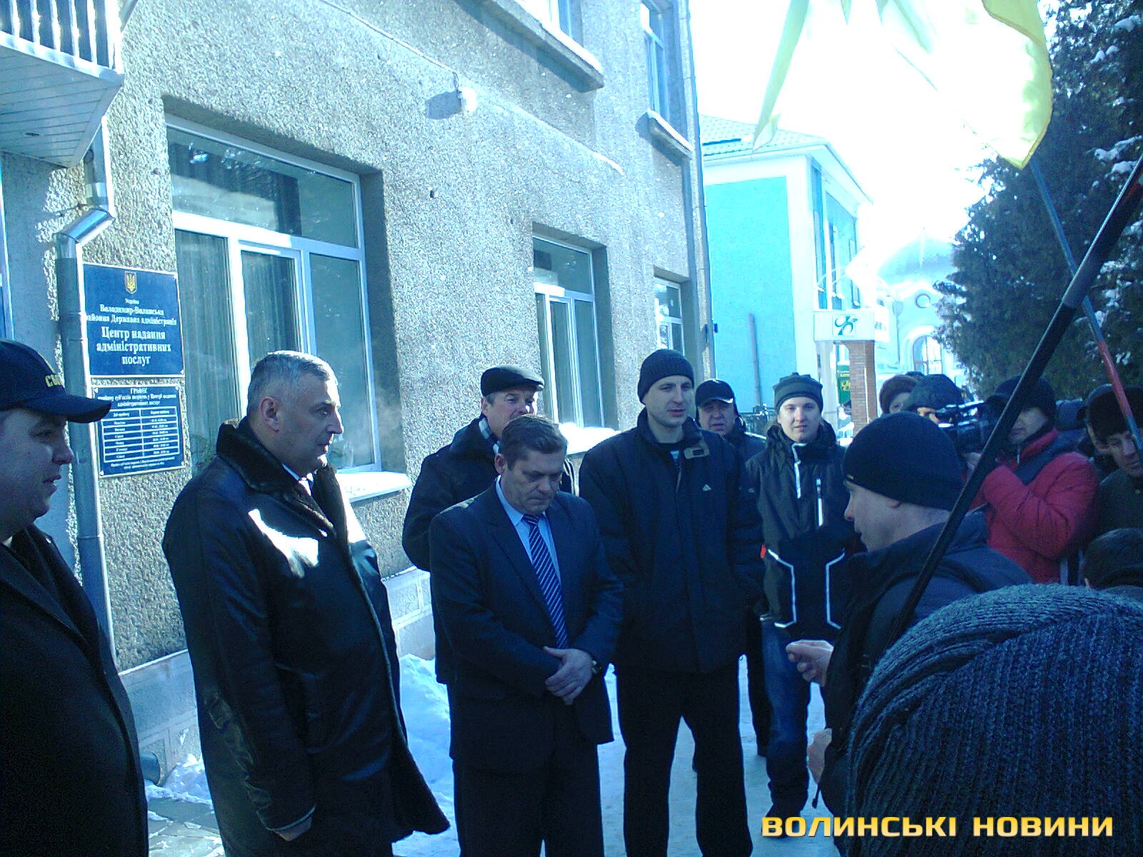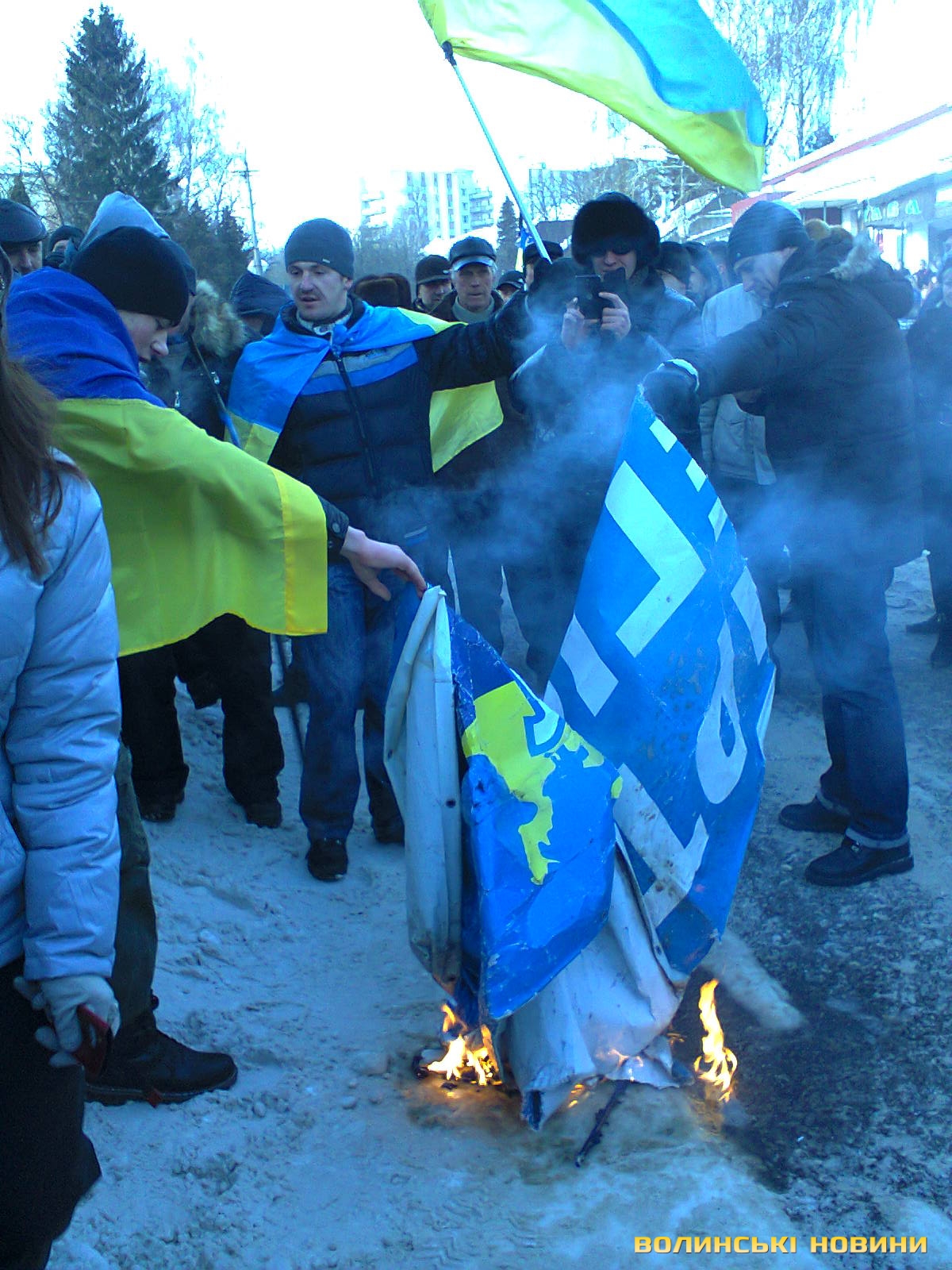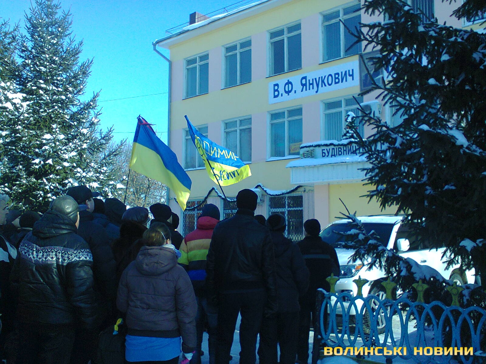 Тоді за годину на площі Героїв зібрався кількасотенний натовп. Всі дивилися на транспарант Ковальчука і рішуче вимагали його зняти. Лунали гасла «Зека геть!», «Знімай плакат».До олігарха пішла група людей, щоб передати вимогу натовпу, але той відмовив. І тоді полетіли яйця, ніхто вже не хотів чекати автокрана, що в той момент був на площі для демонтажу новорічної ялинки. Частину транспаранта протестуючі здерли самостійно, решту прибрали хлопці з комунальної служби.Після зняття транспаранта мітингувальники пішли до Володимир-Волинської РДА. На їх вимогу вийшли голови РДА Валентин Скуба та райради Степан Слащук. Обидва на той час були членами Партії регіонів. Люди поставили їм ультиматум вийти з цієї партії та залишити займані посади. Від цього посадовці відмовилися.23 січня жителі міста завітали і до офісу Партії регіонів. З собою вони вели і голову РДА Валентина Скубу, як одного із представників цієї політичної сили. Великий банер із символікою партії зняли з фасаду і, разом з прапором регіоналів, спалили їх.Не витерпів «випробовування» вогнем і прапор Комуністичної партії. І якщо місцеві регіонали перелякалися й забилися в нори, то лідерка місцевих червоних ще й викликала міліцію, аби поскаржитися на таке-от «народне свавілля».25 січня активісти вісім годин блокували Володимир-Волинську райраду, де в цей час відбувалася позачергова сесія, на порядок денний якої тоді винесли два питання: відставка голови районної ради Степана Слащука та висловлення недовіри голові РДА Валентину Скубі. Депутатів на сесію люди звозили з цілого району, а від присутніх регіоналів вимагали вийти із цієї політичної сили. Майже усі депутати-регіонали з партії вийшли, окрім Анатолія Верка, який займав посаду заступника голови РДА.