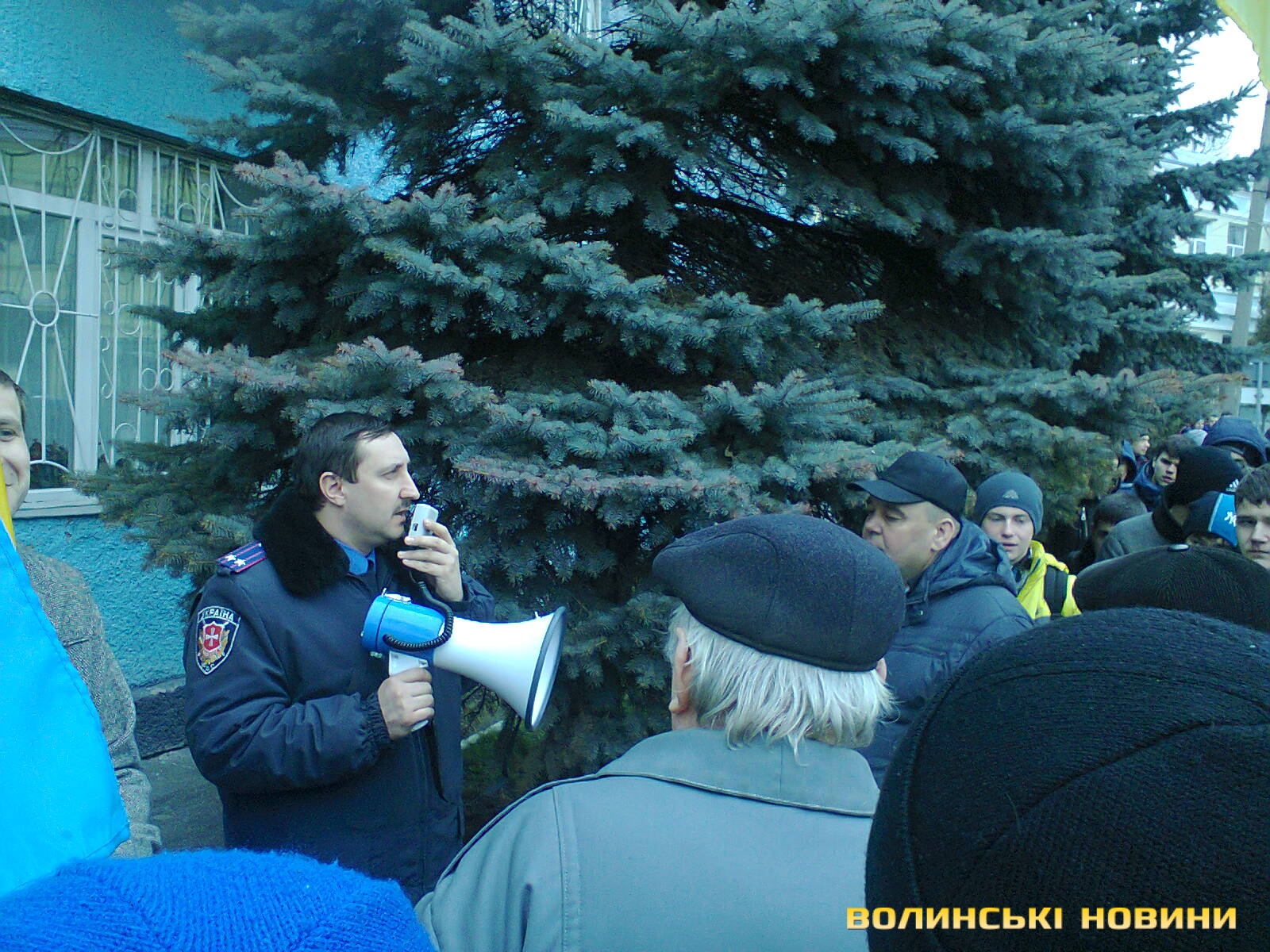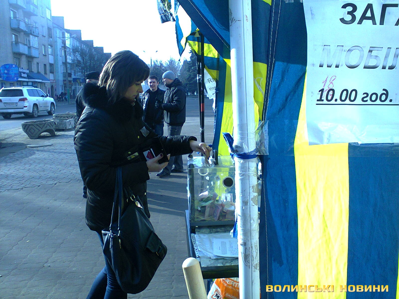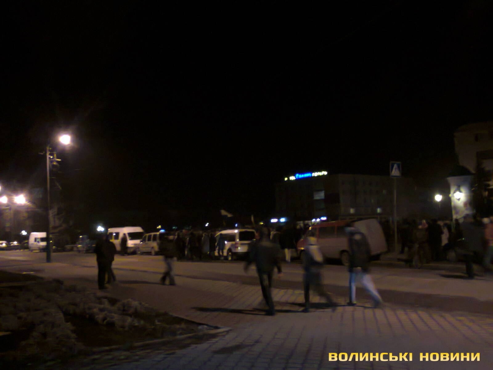Щоправда, обурених регіоналів правоохоронці злякалися більше, ніж нардепа, і стенд усе ж забрали. Людей такі дії міліціонерів дуже обурили і вони не боячись висловлювали все, що думають про нашу міліцію.18 лютого чимала кількість володимир-волинців була у колоні «Мирного наступу», що йшла до Верховної Ради. Тітушки та беркутня розпочала масову зачистку мирних протестуючих. Майдан у Києві палав, падали безневинні, по-звірячому вбиті чоловіки та жінки, яких згодом назвуть Героями Небесної Сотні. Покалічених беркутом привезуть і у наше місто.Ввечері 18 лютого на площу Героїв вийшли сотні володимир-волинців. Жодних промов та виступів не було. Привезли бочки для обігріву і люди готувалися їхати на Київ. Володимир-волинці підсіли в автобуси до нововолинців, але на виїзді з міста їх зупинили місцеві правоохоронці. Хтось дав знати про це людям, які були на площі, і всі вони кинулися визволяти з «міліцейських обіймів» майданівців, що і було успішно зроблено.Наступного дня жителі міста прийшли до будівлі Володимир-Волинської РДА та зайшли в приміщення, але «регіонального» керівництва району не було на робочих місцях. Практично усі кабінети адміністрації виявилися зачиненими.Від РДА люди пішли під міськвідділ міліції, а його тоді очолював уродженець Харкова Володимир Коваленко. Від нього хотіли почути, чому затримали автобус, що їхав на Київ. Але розумних пояснень своїм діям він не надав. Міліціонери запевнили людей, що володимир-волинська міліція до Києва не поїде, а залишиться в місті охороняти громадський порядок. Згодом, володимир-волинська міліція передала свої засоби захисту на Майдан у Київ.20 лютого віче постановило піти у «гості» до найбільш одіозних представників Партії регіонів у місті, які до останнього трималися за партійний квиток. Одним із таких був Володимир Смоляр – директор Володимир-Волинського ВПУ. До людей він вийшов абсолютно спокійним, повідомив, що напередодні вийшов з Партії регіонів і на крики «Ганьба» лише посміхався. Його захищати відразу прибігли два депутати - міської ради Руслан Мороз та обласної Олег Борбелюк.Не вийшли до людей працівники Володимир-Волинської прокуратури. Попри те, що 20 лютого була середа і робочий день, прокуратура була зачиненою, працівників на робочому місці не було, а на вхідних воротах установи висів замок.Натомість очільник місцевого СБУ Андрій Віщик до людей вийшов, але відмовився виходити зі складу виконкому Володимир-Волинської міськради, як того від нього вимагали люди.23 лютого на народному віче один із активістів вручив міському голові Петру Саганюку будьонівку, як символ того, що очільник Володимира-Волинського, як тільки в Києві змінюється влада, постійно змінює політичні партії. Слід зазначити, що до лютневих подій ні мер міста, ні працівники міськради на місцевий Майдан не ходили.Більше години 24 лютого простояв на центральній площі Володимира-Волинського гіпсовий бюст Леніна, якого активісти Майдану винесли з офісу Комуністичної партії. Також з офісу комуністів винесли усю партійну символіку та спалили її. Постраждав від пожежі й Ілліч, але його навіть підсмаленого та побитого комуністи забрали назад.25 лютого володимир-волинці прийшли під міську раду з вимогою відставки мера Петра Саганюка. Але той виявився не ликом шитим і на свою підтримку зібрав працівників б