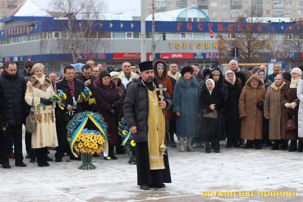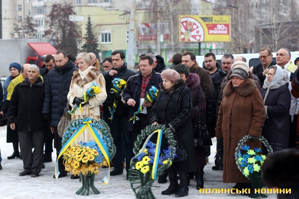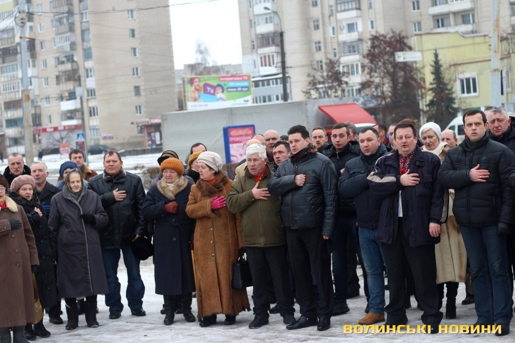 Після молитви та промови представника духовенства присутні поклали квіти до постаменту майбутнього пам’ятника, після чого зі спільного виконання гімну України розпочався мітинг.Голова Братства вояків ОУН-УПА Волинського краю імені полковника Клима Савура Василь Кушнір нагадав, що вже декілька років пам'ять Степана Бандери вшановують у Луцьку поблизу п’єдесталу його майбутнього пам’ятника, на спорудження якого постійно бракує коштів. Він висловив сподівання, щоб наступного року мітинг відбувався поблизу вже збудованого за кошти українського народу гарного пам’ятника.Олександр Пирожик зауважив, що повстанці в криївках, Небесна сотня та військові-волиняни на сході принесли себе в жертву, довівши, що ідея нації невмируща і ніколи не переводилися справжні воїни в Україні. З його слів, сіра орда Московії не зможе подолати українців, тому що у ній немає справжніх воїнів. Він наголосив, що жодні інформаційні війни не зможуть перекреслити світле ім’я людини, яка зуміла увібрати енергетику Господа, сказавши, що є ідея, заради якої можна вмирати, щоб потім воскресати у наступних поколіннях.