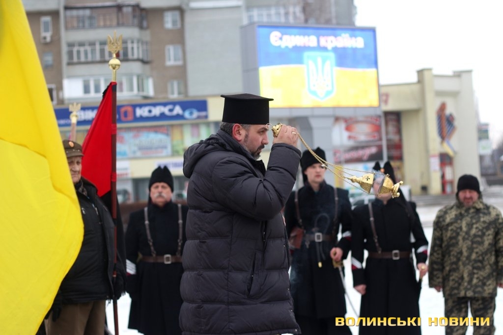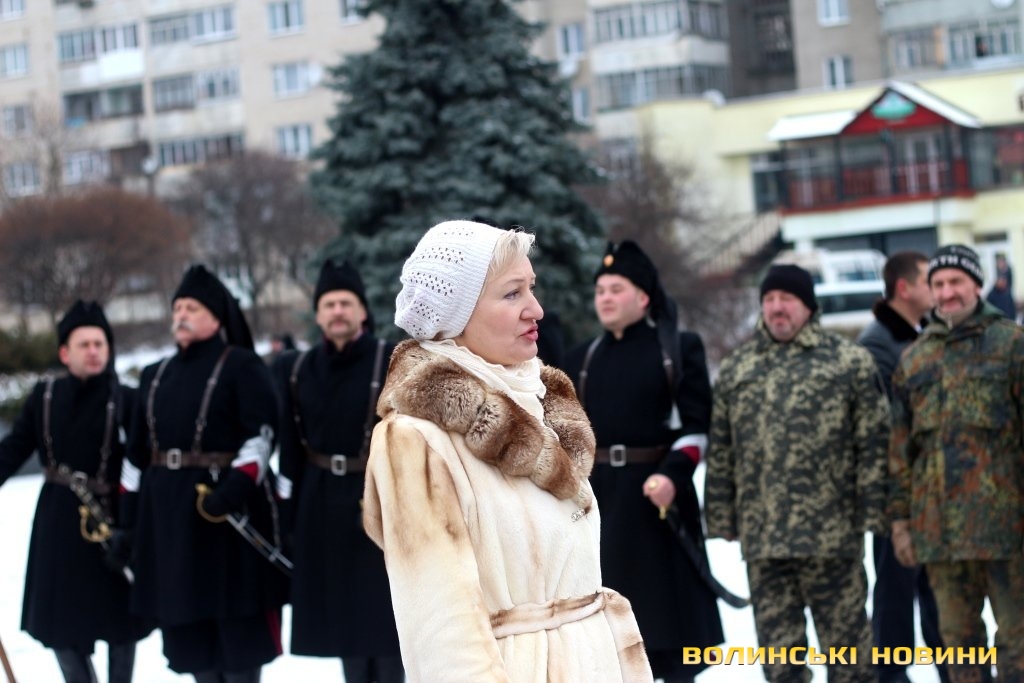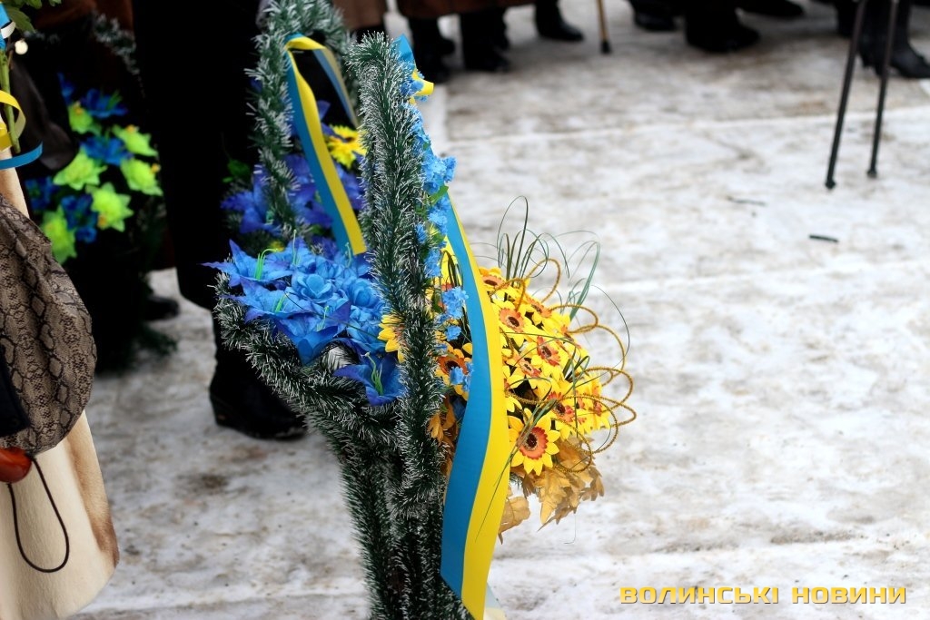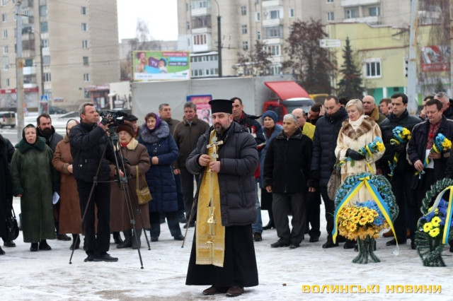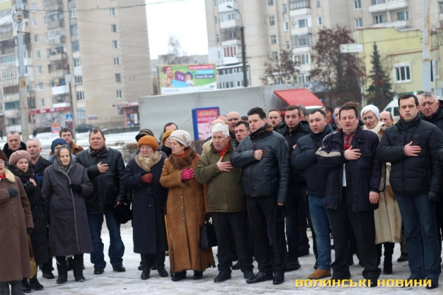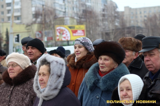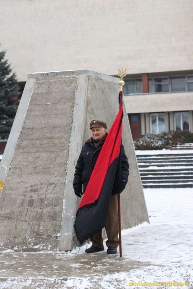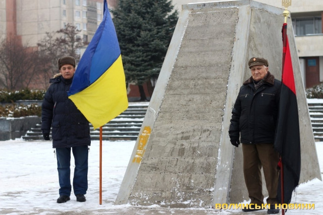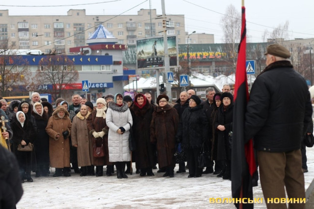 Приблизно сотня лучан, серед яких були представники обласної та міської влад, ветеранських та козацьких організацій, зібралася поблизу постаменту майбутнього пам’ятника Степану Бандері у Луцьку.