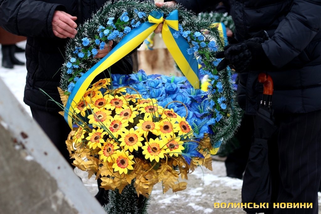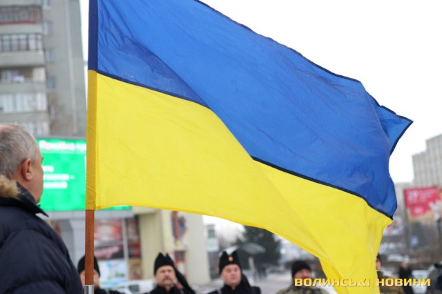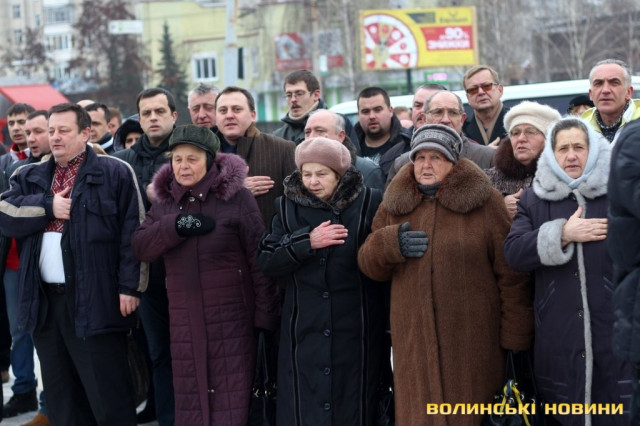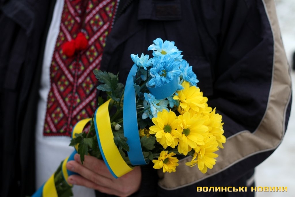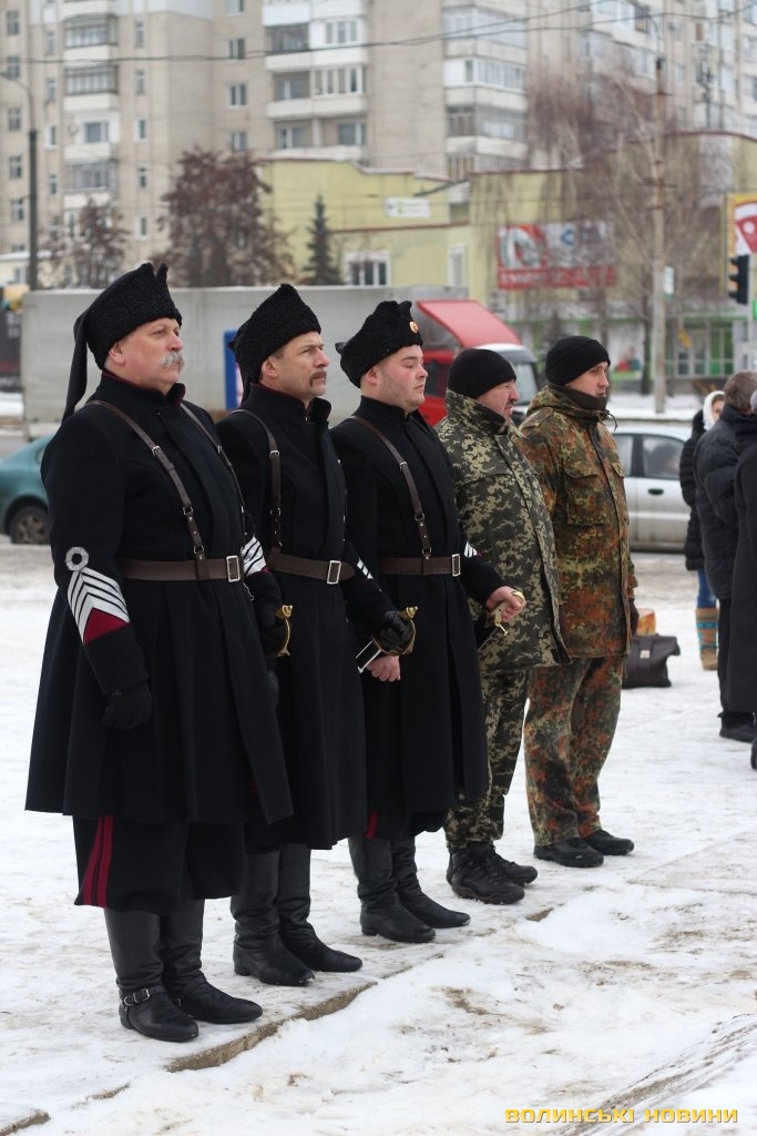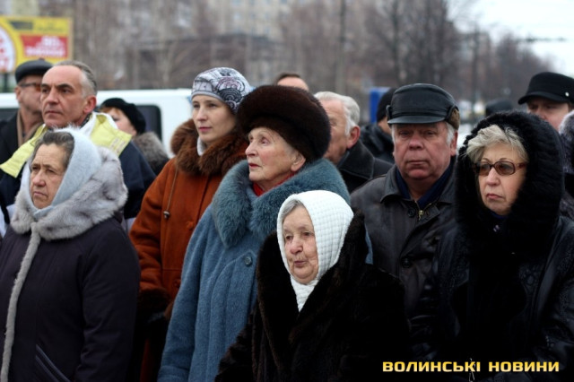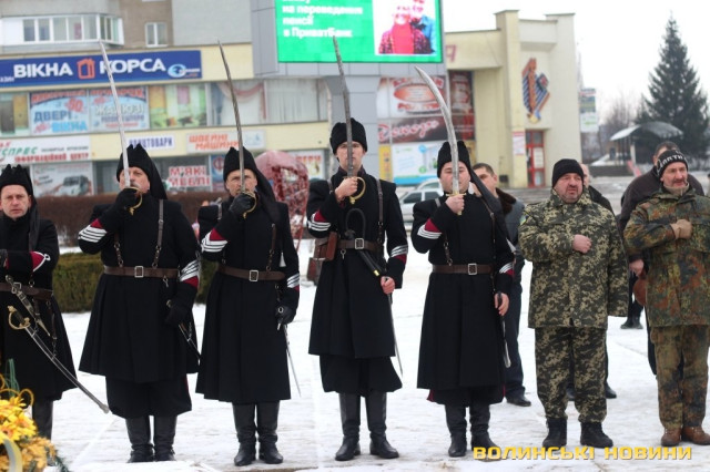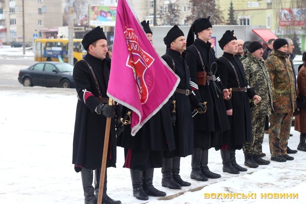 Приблизно сотня лучан, серед яких були представники обласної та міської влад, ветеранських та козацьких організацій, зібралася поблизу постаменту майбутнього пам’ятника Степану Бандері у Луцьку.