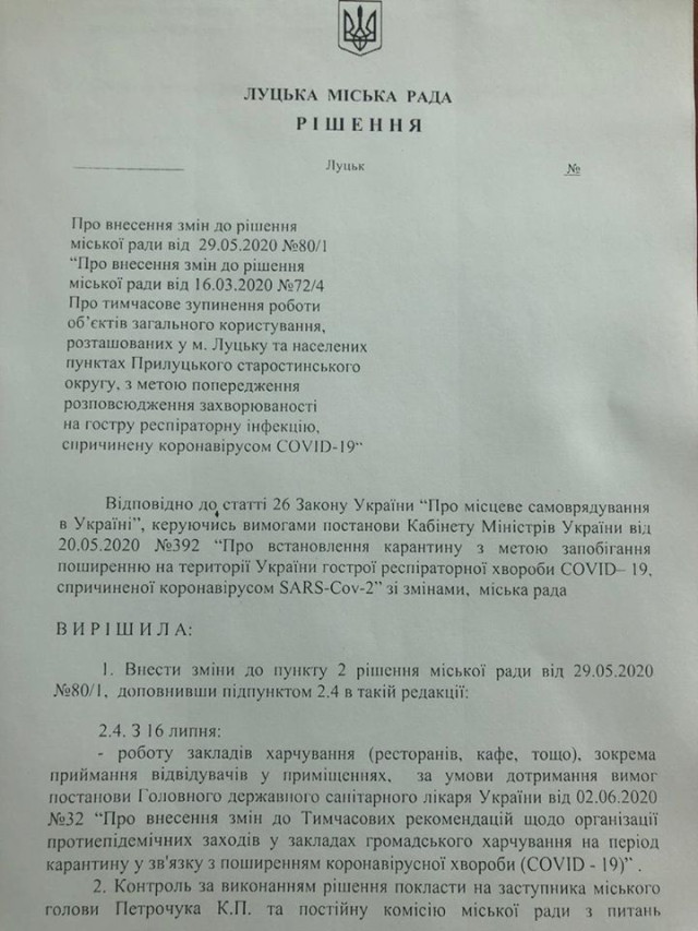 Як повідомлялося, з 16 липня на території Луцька та Прилуцького старостинського округу закладам громадського харчування дозволили приймати відвідувачів у приміщеннях. Відповідне рішення депутати міської ради прийняли на сесії 14 липня.
