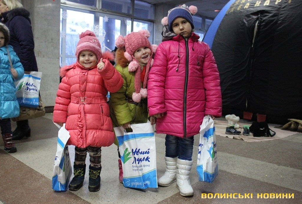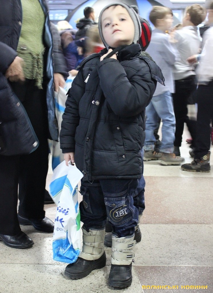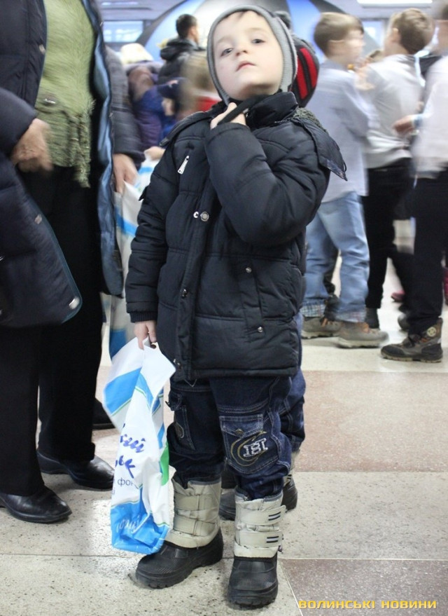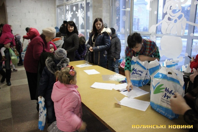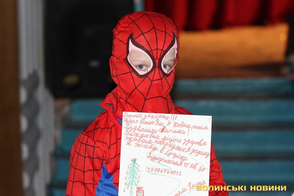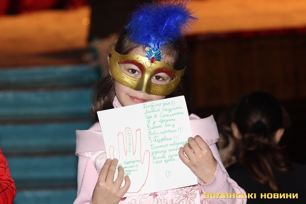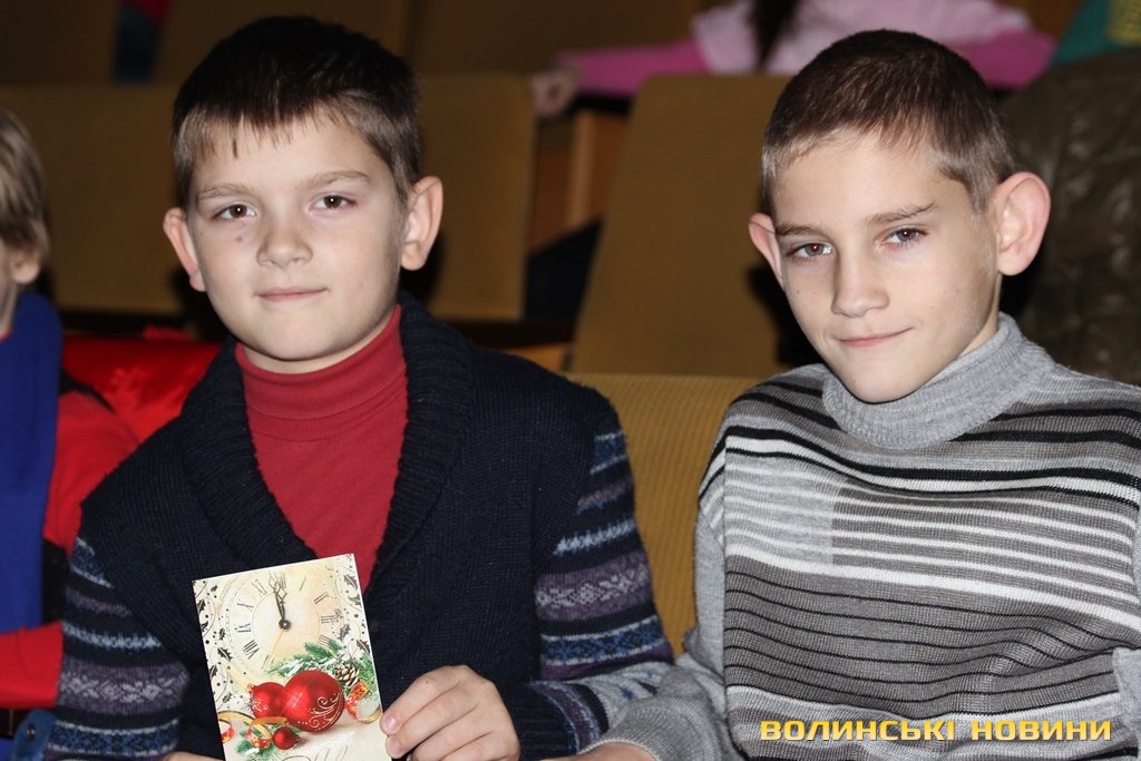«Ми запросили тих, ким опікується наш центр, а це дітки, які опинилися у складних життєвих обставинах, діти-інваліди, діти-сироти, а також діти, чиї батьки є учасниками АТО. Допомогли організувати захід благодійники», - розповідає для Інформаційного агентства Волинські Новини директор Луцького міського центру соціальних служб для сім’ї, дітей та молоді Ліна Галан.«Сьогоднішнє свято – особливе, бо добігає до кінця такий непростий рік в Україні. Це рік великих випробувань, і ми усі разом зробили все, щоб цей рік достойно завершився. Разом з тим, цей рік був визначальним, адже ми побачили, як багато поміж нас мужніх, хоробрих і достойних українців, які вміють боронити нашу землю, вміють відстоювати нашу гідність. І сьогодні наш фонд прийшов з подарунками до вас, діти, щоб привітати й подякувати, що ви вчилися гарно, слухалися батьків. У новому році бажаю і здоров’я, і добра, а найголовніше – миру і затишку в нашій країні. Також від імені Ігоря Петровича Палиці, від багатьох українських бійців дякую за ваші щирі вітання, які ви написали на святі. Вони вже з понеділка поїдуть на схід до наших бійців, декому передамо у госпіталь. Я думаю, що ці ниточки добра й тепла, які ви протягнули, зігріють серця і душі багатьох бійців», - розповіла заступник голови правління Фонду Ігоря Палиці «Новий Луцьк» Ірина Констанкевич.Написав листівку для військових і семирічний Артем.