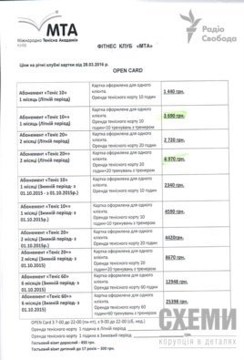 У прейскуранті послуг, який надав менеджер, заклад і сам себе позиціонує не як спортшколу, а саме як приватний фітнес-клуб. Влітку 10 годин занять тенісом із тренером обійдеться у 3690 гривень, 20 тренувань із тренером – 6970 гривень. Двотижневе проживання дитини в академії із заняттями тенісом також обійдеться недешево.