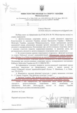 Заступник міністра молоді та спорту Іван Гоцул підтвердив «Схемам» у відповіді на запит, що законом України «Про фізичну культуру і спорт» не передбачено плату за тренувально-навчальний процес у дитячо-юнацьких спортивних школах.