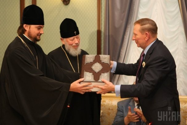Митрополит Володимир і єпископ Олександр дає Леонідові Кучмі Пересопницьке Євангеліє, 20 травня 2009 рік.