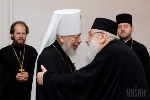 Митрополит Володимир і Любомир Гузар перед початком засідання Всеукраїнської Ради церков та релігійних організацій, в Києві, 28 жовтня 2009 рік.