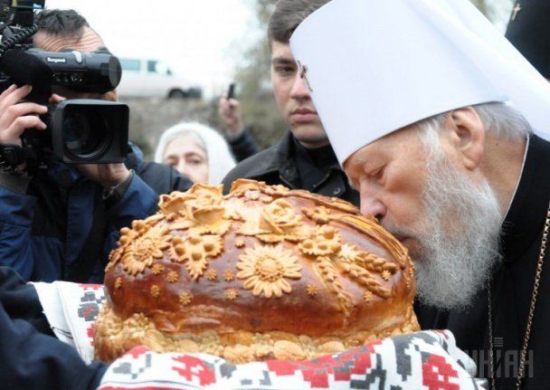 Митрополит цілує коравай під час церемонії відкриття пам’ятника Єлисею Плетенецькому у Радомишлі, 29 жовтня 2009 рік.