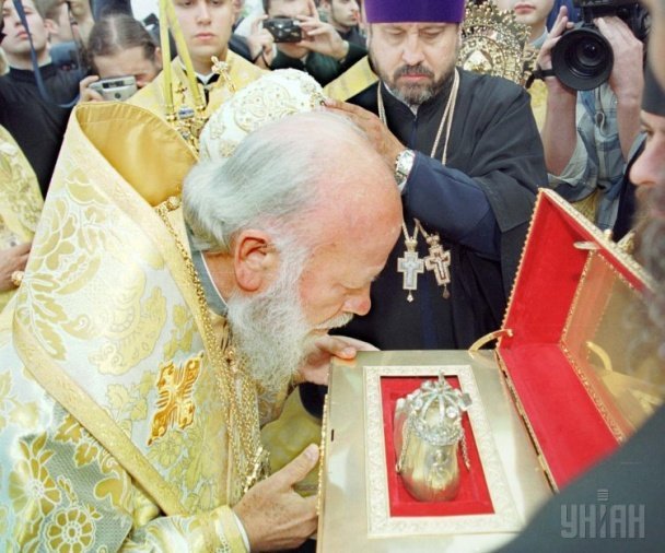 Митрополит Володимир прикладається до раки, у якій зберігається стопа святого Андрія Первозваного. 28 червня 2003 рік.
