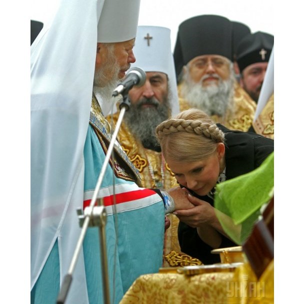Митрополит Володимир і Юлія Тимошенко біля пам’ятника святому рівноапостольному князеві Володимиру на Володимирській гірці у Києві, 26 грудня 2009 рік.