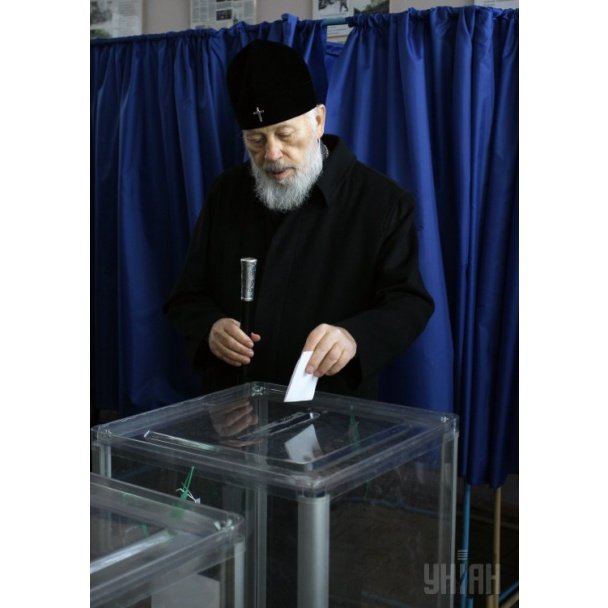 Митрополит Володимир опускає виборчий бюлетень в день другого туру виборів президента України, 7 лютого 2010 рік.