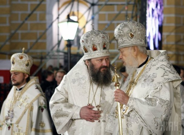 Митрополит Володимир і секретар митрополита Олександр під час Божественної літургії в Свято-Покровському жіночому монастирі, 14 січня 2012 рік.