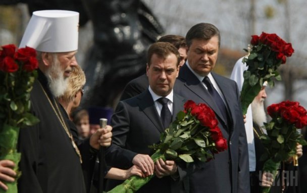 Митрополит Володимир, Віктор Янукович і Дмитро Медведєв під час покладання квітів до меморіалу ліквідаторам аварії на ЧАЕС, в Чорнобилі, 26 квітня 2011 рік.
