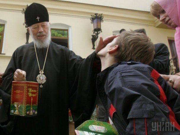 Владика передає подарунки дітям на території Свято-Успенської Києво-Печерської Лаври, 27 квітня 2008 рік.