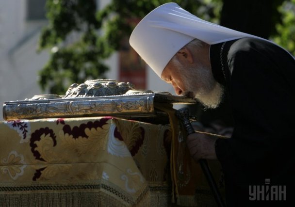 Цілує ікону під час Божественної літургії, яку він провів на площі перед Успенським собором в Києво-Печерській лаврі, 28 липня 2008 рік.