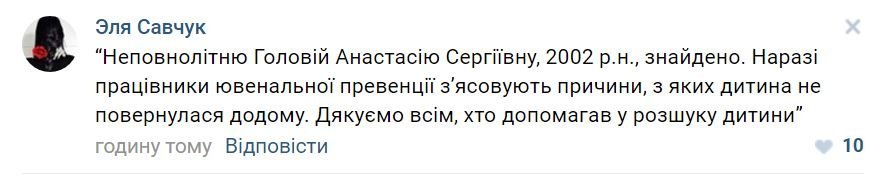 «Неповнолітню Головій Анастасію Сергіївну, 2002 р.н., знайдено. Наразі працівники ювенальної превенції з’ясовують причини, з яких дитина не повернулася додому. Дякуємо всім, хто допомагав у розшуку дитини», - повідомляє Єля Савчук.
