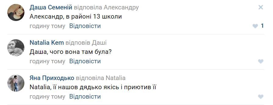 У коментарях користувачі пишуть, що дівчину знайшли в районі школи №13. Буцімто дитину розшукав якийсь чоловік та прихистив на ніч.