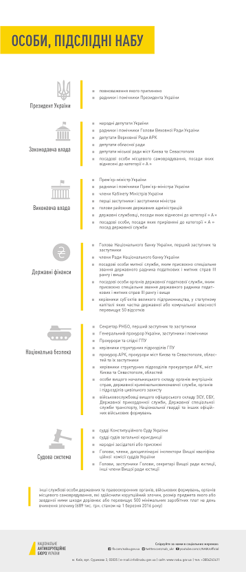 Загальна кількість українських посадовців, потенційно підслідних НАБУ, перевищує 20 тисяч осіб. В основному це – вищі посадові особи (від Прем’єр-міністра до мерів міст обласного значення та керівників райдержадміністрацій), керівники державних підприємств, особи вищого офіцерського складу силових структур, судді усіх рівнів, тощо.