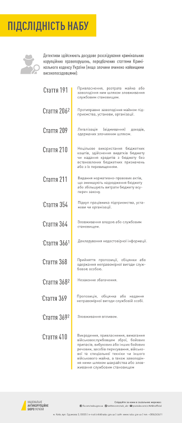 Повна підслідність НАБУ викладена у статта 216 Кримінального процесуального кодексу України.