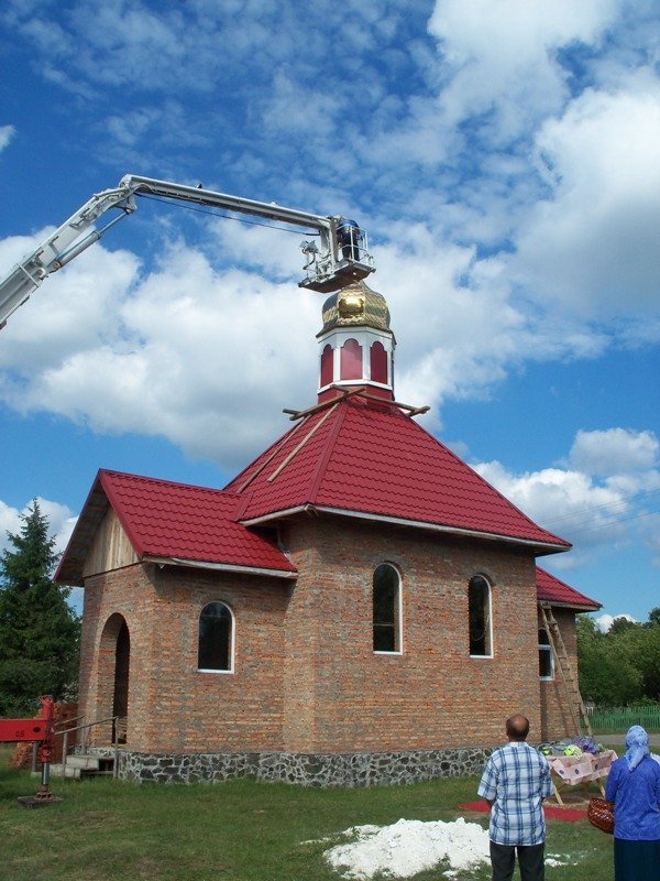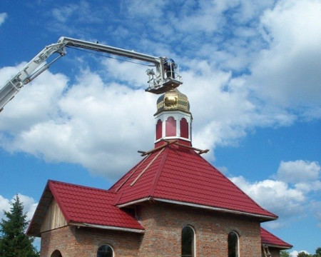 У спеціальну люльку автомобіля помістили трьох робітників, які мали встановити п’ять хрестів на куполи культової споруди.