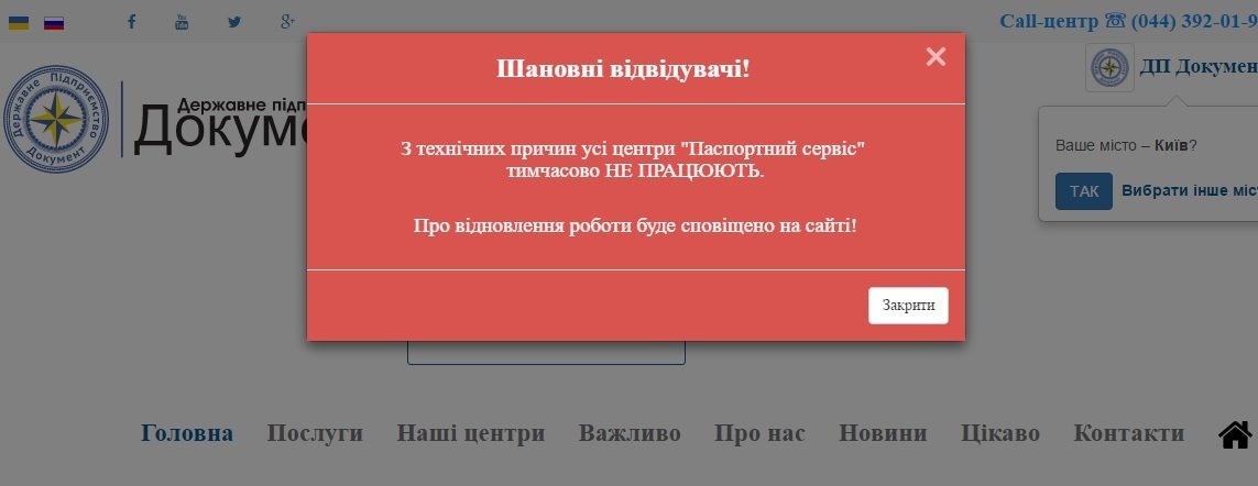 "З технічних причин усі центри "Паспортний сервіс" тимчасово не працюють. Про відновлення роботи буде сповіщено на сайті", - йдеться у повідомленні сайту з видачі закордонних паспортів.