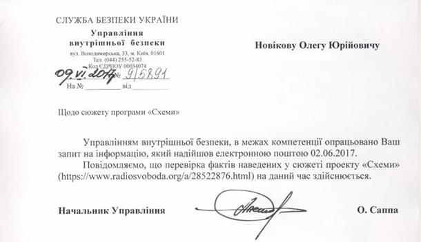 «Управлінням внутрішньої безпеки в межах компетенції опрацьовано Ваш запит на інформацію, який надійшов електронною поштою 2 червня 2017 року. Повідомляємо, що перевірка фактів, наведених у сюжеті програми «Схеми», в даний момент здійснюється», – зазначив Олександр Саппа.
