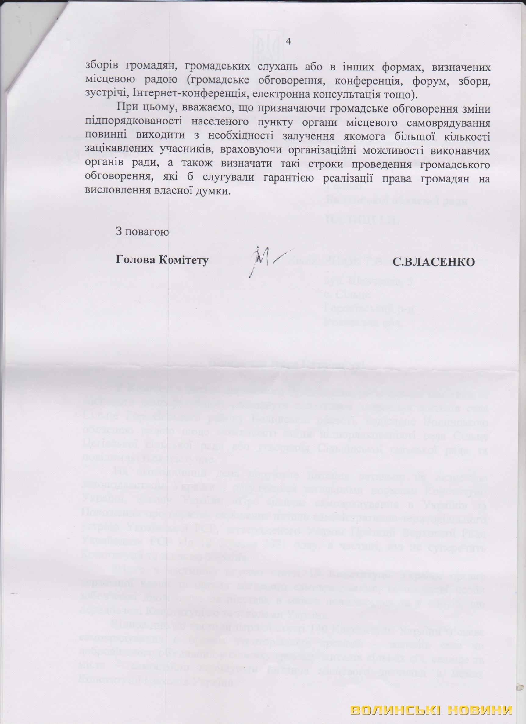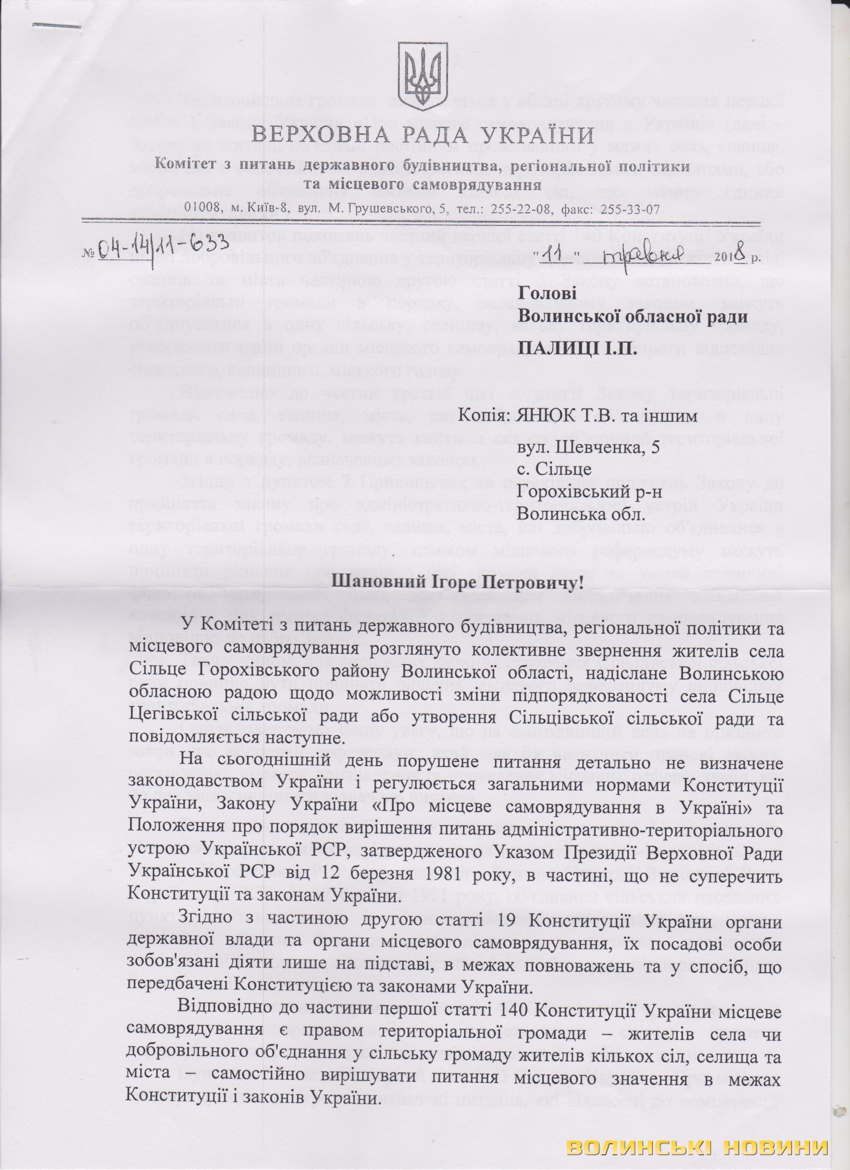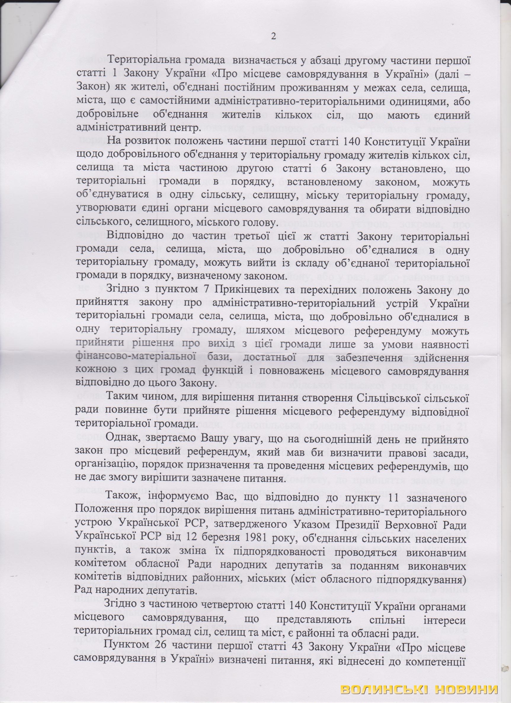 «Можна йти іншим шляхом: зміна підпорядкованості села Сільце, вивівши його з Цегівської сільської ради і підпорядкувати іншій раді - територіально найближчій до Сільця. Такі прецеденти вже є в Україні. Тому ми звернулися до Волинської обласної ради з таким проханням, але отримали відповідь, що наше звернення перенаправлено в Комітет з питань державного будівництва Верховної Ради для надання роз’яснень. І відповідь не забарилася. В ній йдеться, що питання зміни підпорядкованості села належать до повноважень обласної ради.