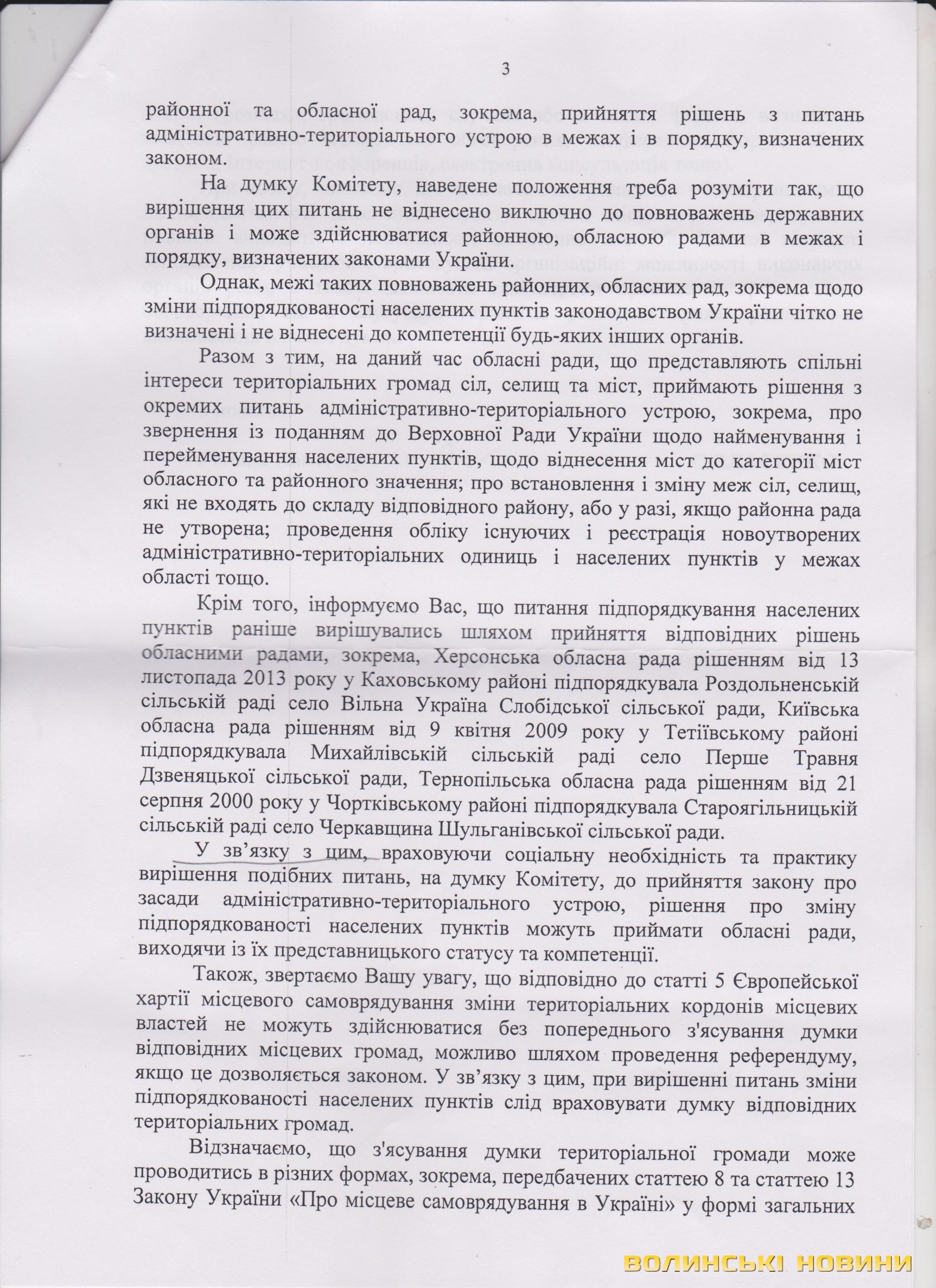 Короткий витяг із відповіді Комітету з питань державного будівництва, регіональної політики та місцевого самоврядування: «На сьогоднішній день порушене питання детально не визначене законодавством України і регулюється загальними нормами Конституції України, Закону України «Про місцеве самоврядування в Україні» та Положення про порядок вирішення питань адміністративно-територіального устрою Української РСР, затвердженого Указом Президії Верховної Ради Української РСР від 12 березня 1981 року, в частині, що не суперечить Конституції та законам України.