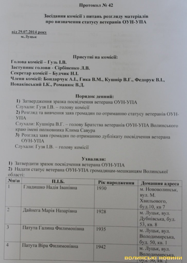 Статус ветерана ОУН-УПА громадяни-мешканці Волинської області отримали: жителька Нововолинська Надія Гладишко, лучанки Марія Дайнега, Галина Патута та Віра Патута.Учасники комісії вирішили під час наступного засідання перевірити усіх людей, які отримали статус ветерана ОУН-УПА, мовляв у списку є колишні комуністи.