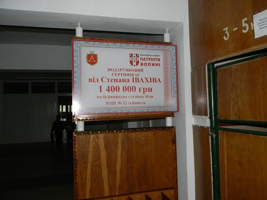 В коридорі зальноосвітної школи №12 міста Ковеля розмістили подарунковий сертифікат від кандидата в народні депутати Степана Івахіва на будівництво стадіону біля цього навчального закладу. В сертифікаті навіть зазначено суму: 1 мільйон 400 тисяч гривень.
