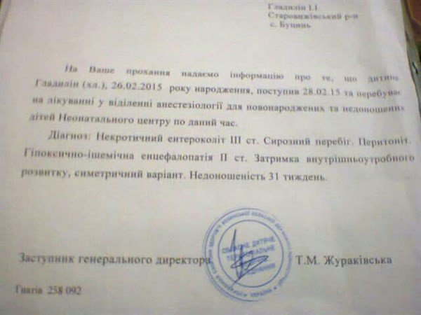 «Потрібна допомога! В моєї подруги народився синочок 7 місяців. Дитина народилась хвора. Стан немовля - критичний. Зараз дитина знаходиться у Луцьку в дитячій лікарні у реанімаційному відділені. Хлопчику щодня на лікування потрібно щонайменше 2000 гривень. Не будьте байдужими. Допоможіть врятувати життя дитини. Мама - Гладилін Ірина. 4188371155022990 - номер банківського рахунку. Банк Аваль. (097) 82 69 303 - номер Іри».