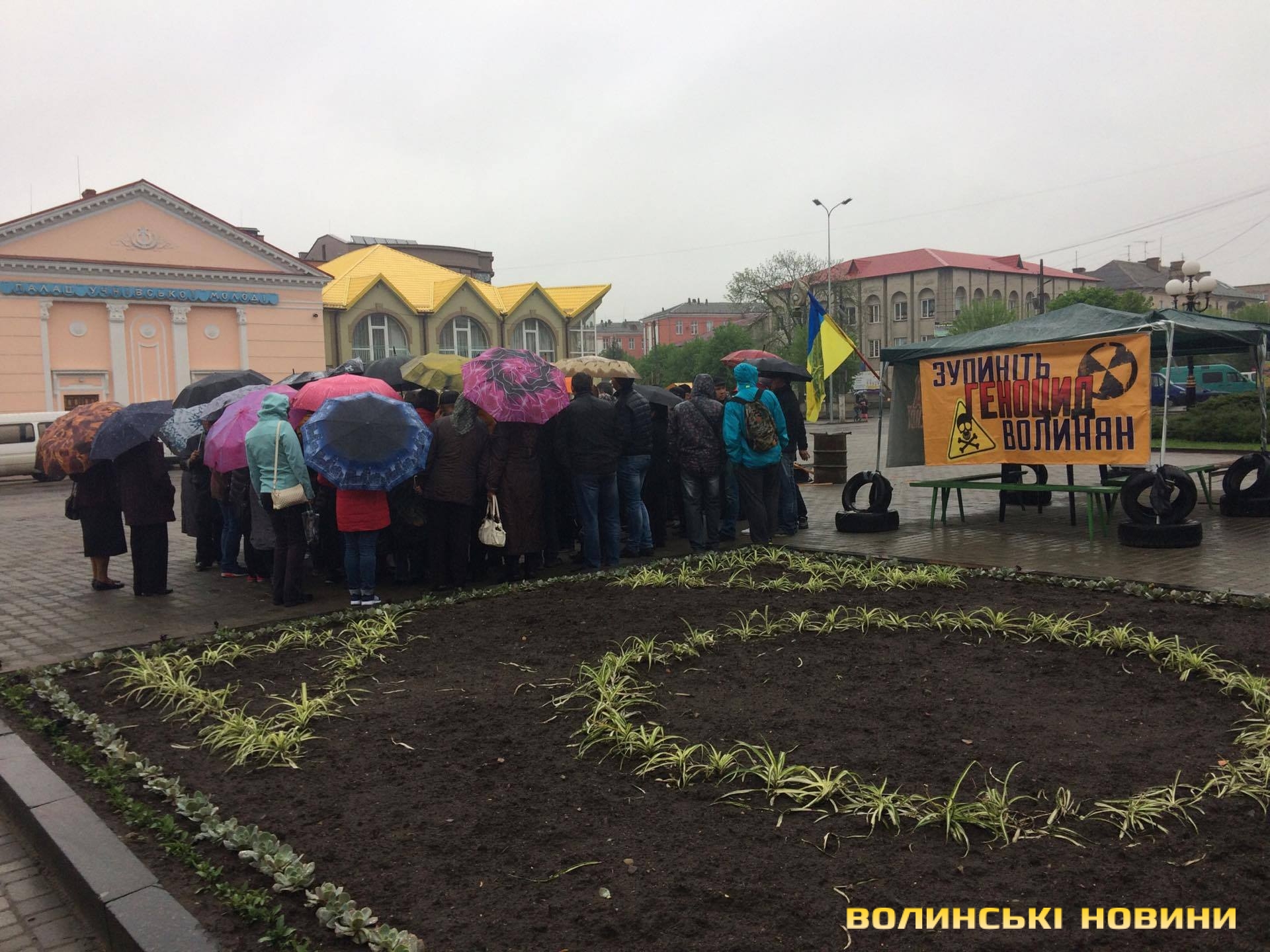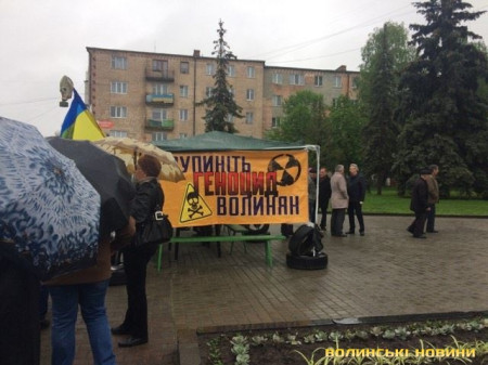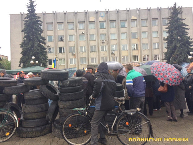 Перед будівлею міської ради у Ковелі зібралися люди, які протестують проти того, аби рештки з ветсанзаводу скидали поблизу їхніх домівок. Також люди вимагають відставки заступника голови Волинської ОДА Сергія Кошарука, який письмово обіцяв ковельчанам, що до 28 квітня рештки з території ветсанзаводу вивезуть. Проте досі цього так і не виконав.