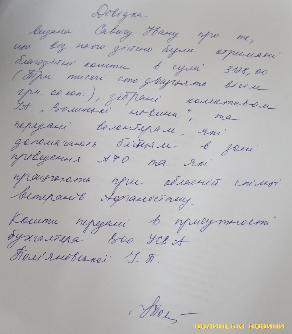 Так, спільними зусиллями вдалось зібрати 3128 гривень.Колектив видання передав кошти в актив Волинської обласної організації Української спілки ветеранів Афганістану, учасники якої є волонтерами та працюють над забезпеченням військовим спорядженням, амуніцією та необхідними речами.