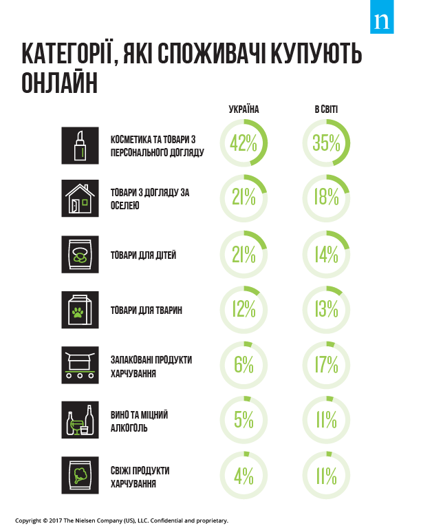 В український віртуальний кошик продукти харчування потрапляють мінімально: 6% опитаних сказали, що в Інтернеті купують упаковані продукти харчування і 4% - свіжі продукти. Для порівняння, тільки у Великобританії та Південній Кореї частка споживачів, які купують свіжі продукти онлайн найвища в списку 64 країн, де проводилося дослідження, - 37%, що показує великий потенціал для рітейлу в інших країнах.