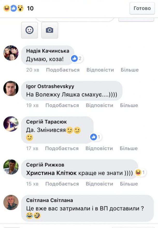 "Боюся спитати, хто це?" – написала Христина Кілюк. Надія Качинська написала, що на її думку це "коза". "На Олега Ляшка смахує", – залишив коментар Ігор Острашевський.