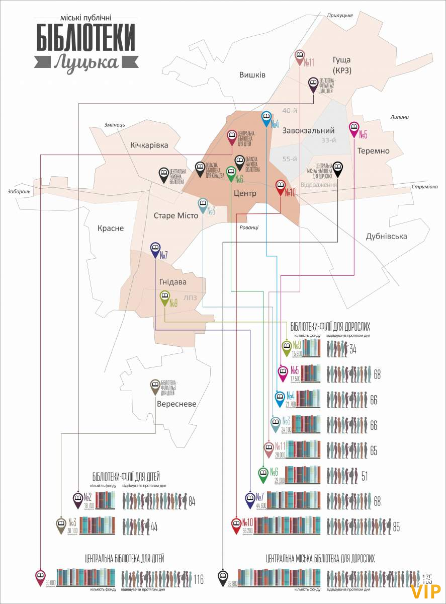 Проаналізувавши інфографіку, розуміємо, що обласний центр Волині налічує 12 біліотек, які розташовані у кожному районі міста. Втім, у районах Вишкова, Дубнівської та Красного (неподалік від Ковельської) бібліотеки відсутні.